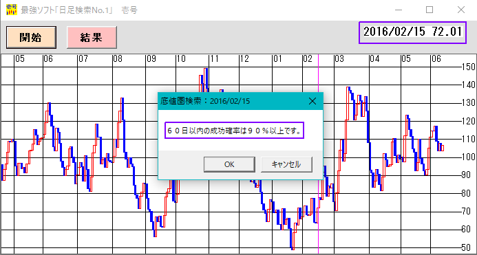 - 今回の相場に乗り遅れた方々も、次回に期待しましょう!そして、その時こそ儲けていこうではありませんか!相場は、なくなりません。日足検索No.1は、過去の日についても調べることが出来ます。それまでに本ソフトの特長を掴んでおき、将来の買い場に備えましょう。